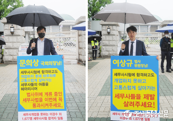 (조세금융신문=김용진 기자) 국회 본회의가 오는 20일로 예정된 가운데, 김범석 한국세무사고시회 조직 부회장(왼쪽)과 강현삼 한국세무사고시회 연수상임이사(오른쪽)가 15일 오전 국회 정문 앞에서 문희상 국회의장과 여상규 법사위위원장에게 국회 법사위에 계류중인 세무사법을 통과시켜 달라는 1인 시위를 하고 있다.