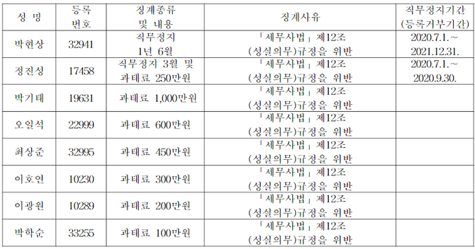 탈루세액이 큰 경우 최대 2년간 직무정지를 받을 수 있다.