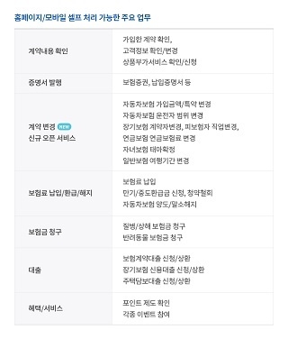 삼성화재 보험 가입 고객이라면 ▲계약내용 확인 ▲증명서 발행 ▲계약변경 ▲보험료 납입/환급/해지 ▲보험금 청구 ▲대출 등 주요 업무를 온라인을 통해 스스로 간편하게 처리할 수 있다.