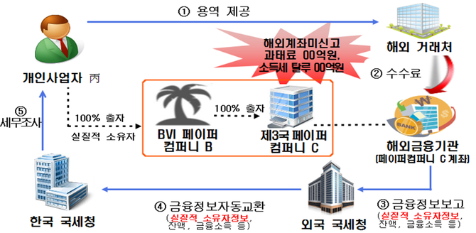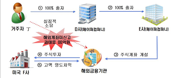 그는 영국령 버진아일랜드에 본인이 100% 출자한 페이퍼컴퍼니 B사를 세우고 제3국에 B사가 100% 출자한 페이퍼컴퍼니 C사를 설립한 후, 페이퍼컴퍼니 C사의 해외계좌로 수수료를 수취하고 해외금융계좌 및 소득세 신고 누락했다.