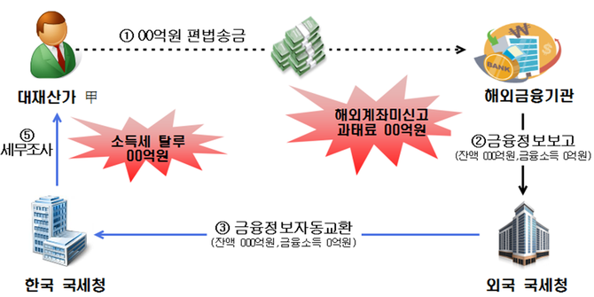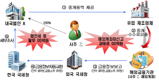국내 중개업체 A사를 운영하는 사주 을도 금융정보 자동교환을 통해 수십억원대 해외계좌와 수억원대 금융소득이 탄로났다.