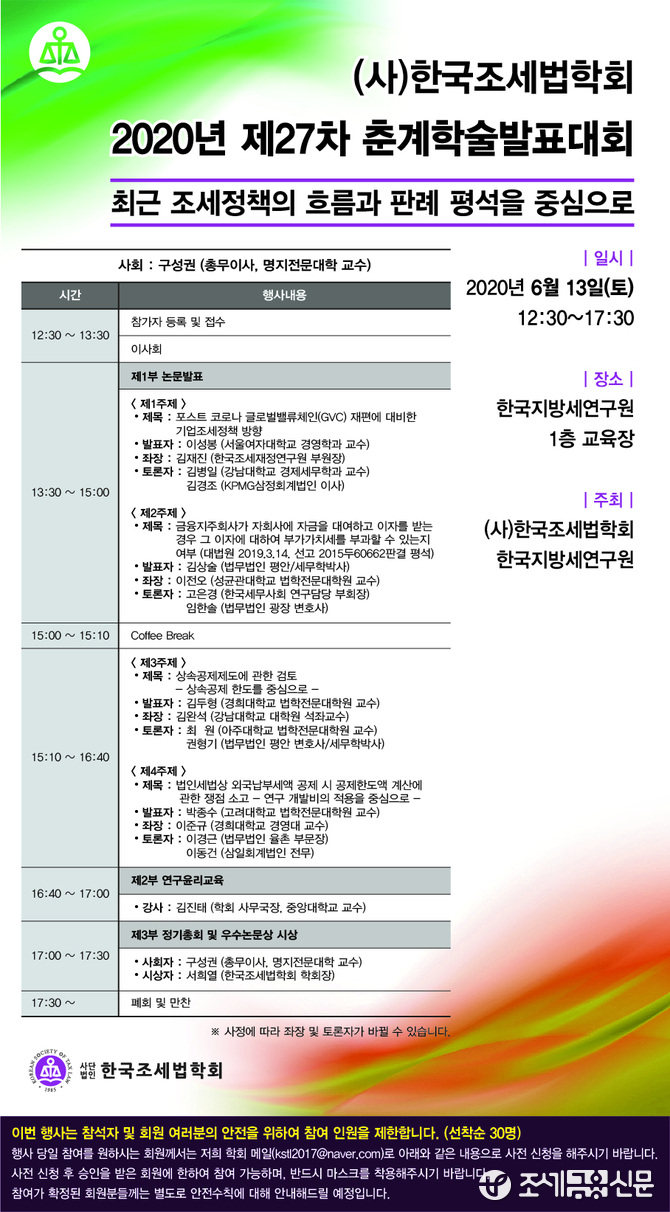 조세법학회 사무국에서는 "행사 당일에 참여하지 못한 회원을 위해 유튜브로 학술발표대회 실황을 중계한다"라며 "당일 참석자는 반드시 마스크를 착용해 달라"고 당부했다.