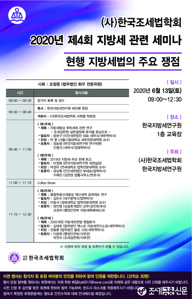 이번 세미나의 참석자는 회원을 포함해 선착순 30명으로 제한된다. 이에따라 장소도 연세대학교 법학전문대학원에서 한국지방세연구원 1층 교육장으로 변경됐다.