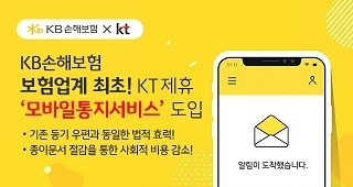 (조세금융신문=방영석 기자) KB손해보험은 KT와 제휴하여 고객 알림 서비스 향상을 위한 ‘모바일통지서비스’를 보험업계 최초로 도입한다고8일 밝혔다.