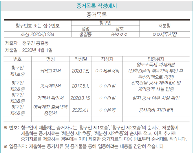 부과처분의 대상과 원인에 잘못이 있는 경우 그 사실 주장내용을 인정받게 할 증거자료를 제시한다. 주장의 요점은 3~4줄로 정리하고 그에 따른 세부적 내용을 그 다음에 주장하면 좋다.