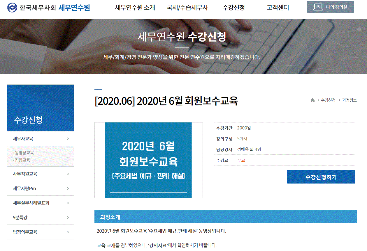 핰국세무사회 관계자는 "2020년 6월 회원보수교육은 전회원이 필수로 들어야 하는 의무교육이므로 ‘2월 개정세법해설 및 법인세 신고안내 회원보수교육’ 또는 ‘4월 종합소득세 신고안내 회원희망교육(보수교육)’을 수강한 회원이더라도 ‘2020년 회원보수교육’을 모두 이수하기 위해서는 반드시 수강해야 한다"고 밝혔다.