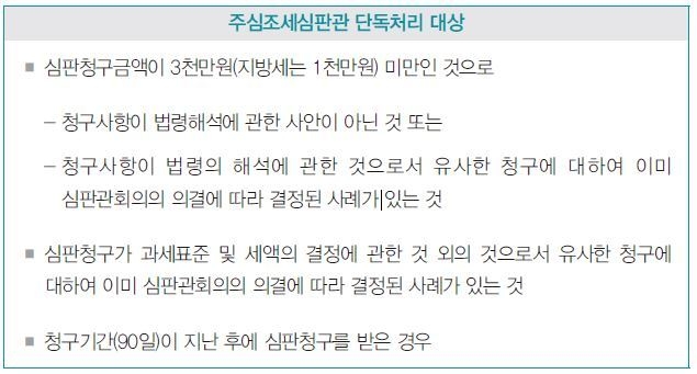 다만 심판청구의 대상이 소액이거나 경미한 경우와 청구기간이 지난 경우에는 조세심판관회의의 심리를 거치지 아니하고 주심조세심판관이 단독으로 심리하여 결정할 수 있다.