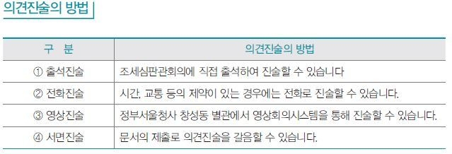 전자신청하거나 의견진술신청서를 제출한다. 전자신청은 조세심판원 홈페이지 > 사이버심판청구 > 의견진술신청에서 확인할 수 있다. 신청사실은 조세심판원 홈페이지에서 확인이 가능하다.