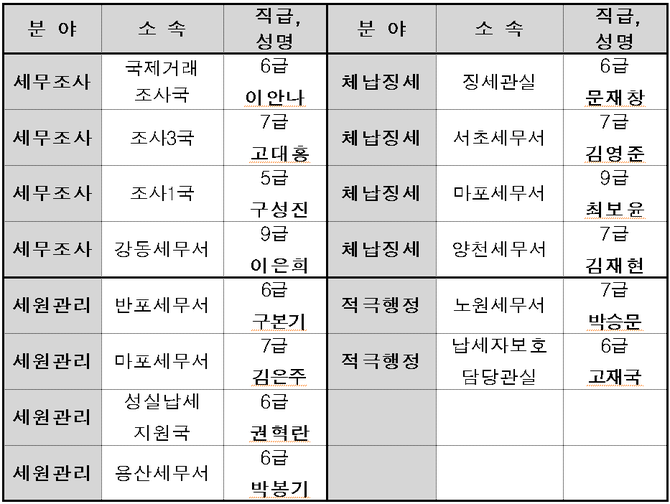 서울청은 세무조사, 세원관리, 체납징세, 적극행정 등 4개 분야에서 새로운 접근 방법, 창의성과 노력도, 조직기여도 등을 종합적으로 심사해 최종 수상자를 선정했다.
