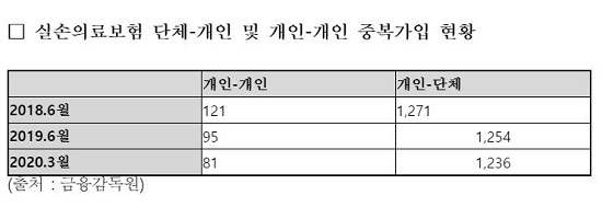 실제 유동수 의원이 금융감독원으로부터 받은 실손의료보험 중복가입 현황에 따르면 2020년 3월말 기준 개인중복가입은 8만 1000명, 단체중복가입은 123만 6000명인 것으로 집계됐다. 이는 단체중복가입자가 개인중복가입자에 비해 15배나 높은 수치다.