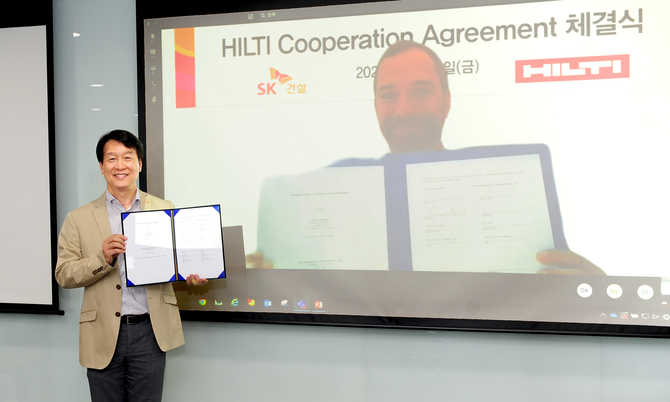 두 회사는 신종 코로나바이러스 감염증(코로나19)의 여파로 오프라인 협약식 행사를 따로 진행하지 않았다. 윤혁노 SK건설 하이테크사업부문장과 라인하르트 쉰들러 힐티 부사장이 양사를 대표해 온라인 화상시스템을 통한 비대면 서명방식으로 협약을 체결했다.