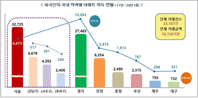 2017년~2020년 5월까지 외국인 2만3219명이 거래한 국내 아파트는 2만3167채로 거래금액은 7조6726억원에 달했다.