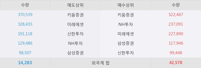 거래원 동향은 NH투자, 미래에셋, 삼성증권 등이 매수 상위 목록에 나타나고 있다.