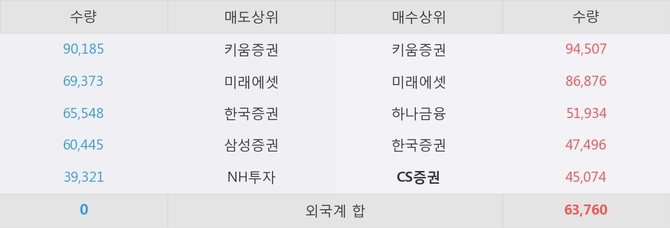 거래원 동향은 CS증권, 미래에셋, 하나금융 등이 매수 상위 목록에 나타나고 있다.