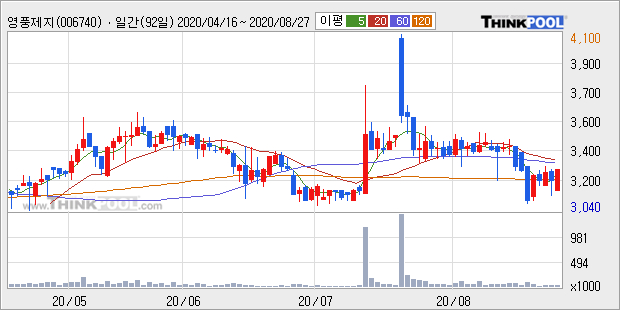 영풍제지는 2019년 매출액 997억원과 영업이익 109억원을 기록했다. 전년대비 매출은 -10.4%, 영업이익은 -39.7% 각각 하락했다. 이 회사의 매출액 증감률과 영업이익 증감률은 각각 코스피 하위 1%, 하위 1%에 해당된다.