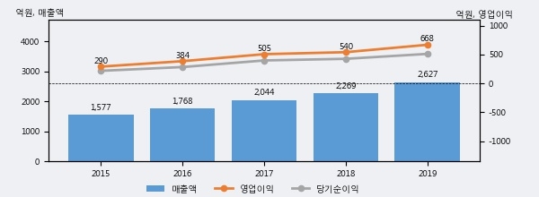 최근 3년간의 실적을 살펴보면 안정적 성장세를 보이고 있다. 최근 3년간 매출로 볼 때 매년 꾸준히 증가하고 있고 그 증가폭도 확대되고 있다.