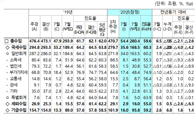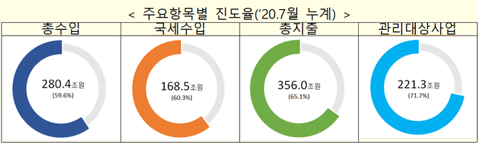 코로나 19로 인해 1~7월까지 누적세수는 20.8조원 감소했으며, 통합재정수지는 75.6조원, 관리재정수지는 98.1조원 각각 적자로 나타났다.