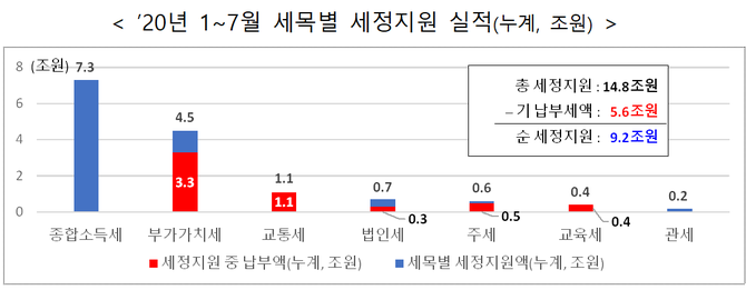 기재부는 세정지원 차원에서 유예해준 세금을 감안하면 실질적인 7월 누적실적은 지난해 같은 시기보다 11.0조원 감소한 178.3조원이라고 설명했다.