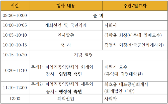 배원기 홍익대 교수가 비영리공익단체의 회계와 감사-입법적 측면, 최호윤 회계법인더함 회계사가 ‘비영리공익단체의 세무와 공시-행정적 측면’ 발표를 담당한다.