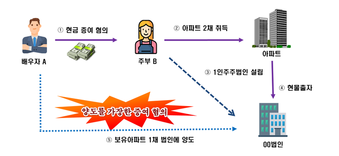 배우자 B도 해당 법인에 자기 소유 아파트를 넘겼다. 그러나 대금수령 여부가 불분명해 양도를 가장해 우회증여한 혐의를 받고 있다.