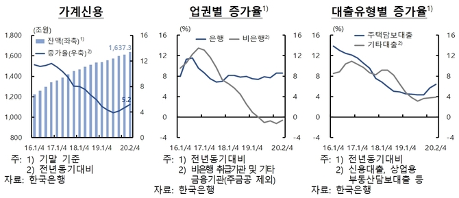 한국은행은 코로나19 확산으로 자영업자 매출 감소와 전반적인 고용사정 악화로 가계의 채무상환능력이 저하됐을 가능성이 큼에도, 원리금 상환유예 등 각종 금융지원 조치로 아직은 신용위험이 현재화되지 않고 있는 것으로 보인다고 분석했다.