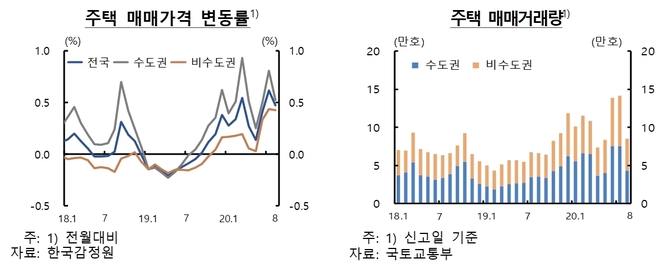 부동산 시장의 경우 주택매매가격이 올해 상반기 중 상승세가 확대됐다가 8월 들어서는 오름세가 다소 둔화되는 모습이다. 주택거래량 역시 가격상승 기대 등으로 수도권을 중심으로 크게 증가했다가 8월 들어 축소됐다.