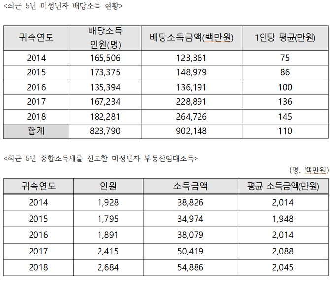 미성년자 배당소득은 2014년 1233억6100만원에서 2018년 2647억2600만원으로 4년 만에 두 배 증가했다.