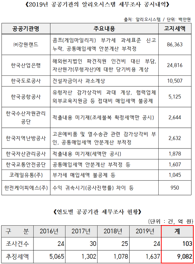 국회 기획재정위원회 소속 김두관 더불어민주당 의원(양산시 을)이 국세청에서 받은 자료에 따르면 2016년부터 2020년까지 세무조사를 받은 공공기관들에서 추징한 세금이 9082억원에 달하는 것으로 드러났다.