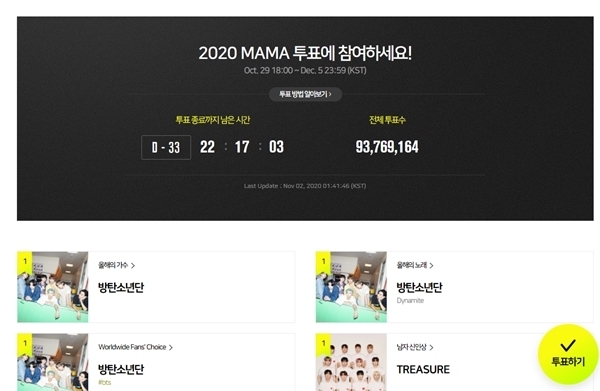 한편, 2020 마마 투표는 오는 12월 5일 자정까지 진행된다. 11월 2일 오전 1시 33분 기준 93,623,388명이 참여하고 있다.