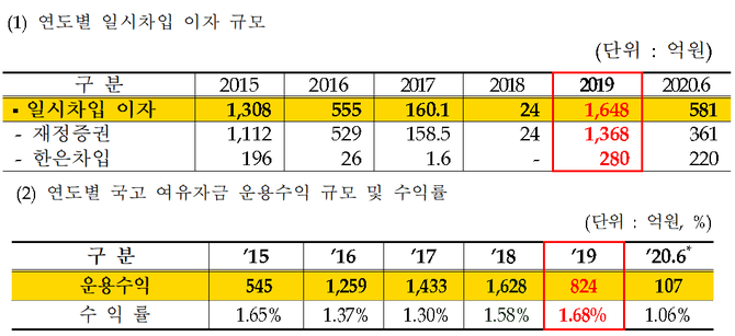 지난해 국고 여유자금 운용수익률은 1.68%, 운용수익은 824억원인 반면 일시차입으로 인한 이자지출 규모는 1648억원에 달했다.