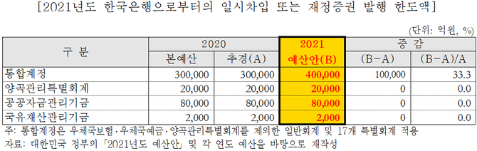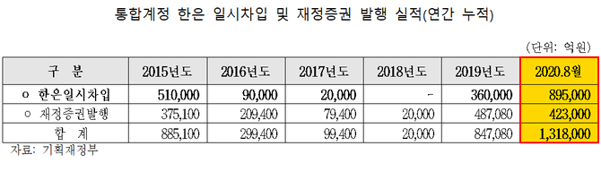 기재부 자료에 따르면 최근 5년간 통합계정의 일시차입 및 재정증권 발행액은 지속적으로 증가해 올해 9월 연중 최고액인 30조원을 기록했으며, 내년 예산은 2020년 대비 10조원 증가한 40조원으로 늘었다.