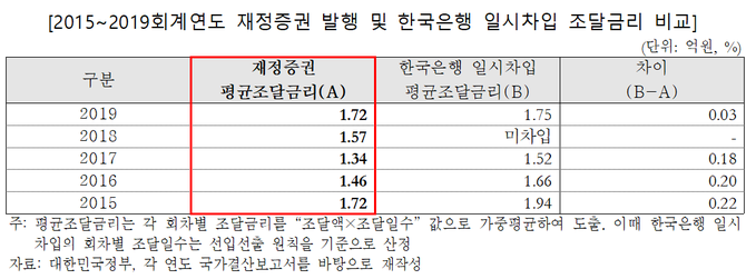 ‘국고금 관리법’상 규정에 따르면 일시차입보다 재정증권을 우선 활용하게 되어 있다. 재정증권 평균 조달금리가 일시차입보다 낮아 국고 부담도 상대적으로 작다.