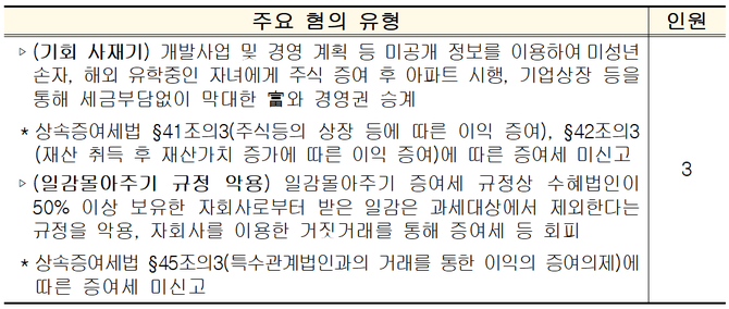 특히 창업주에서 자녀, 자녀에서 손자로 이어지는 경영권 승계 과정에서 세법 규정을 교묘히 회피해 세금 없이 부와 경영권을 물려주는 ‘금수저 대물림’도 집중적으로 살폈다.