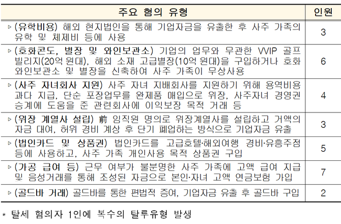 법인카드를 고급호텔, 유흥주점, 해외경비 목적으로 사용하거나, 근무 여부가 불분명한 사주 가족에 고액 급여를 지급하고, 골드바를 통해 편법적인 세금 탈루도 적발됐다.