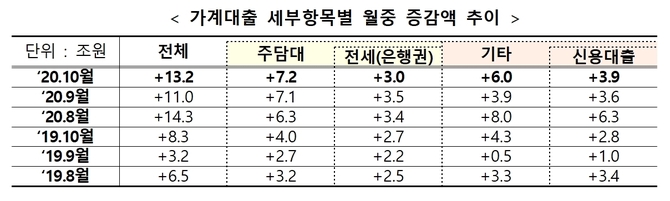 금융위원회와 금융감독원이 11일 발표한 ‘2020년 10월중 가계대출 동향’에 따르면 지난 10월 말 전 금융권 가계대출 잔액은 9월 말 대비 13조 2000억원 증가했다. 전월 대비 2조2000억원, 전년 동월 대비 4조9000억원 증가한 수준이다.
