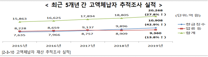 지난해 추적조사 실적 가운데 현금징수 실적은 1조908억원으로 2015년 대비 42.9% 증가하였으며, 압류 등 채권확보 실적 상승률(13.8%) 보다 증가 폭이 매우 가파랐다.