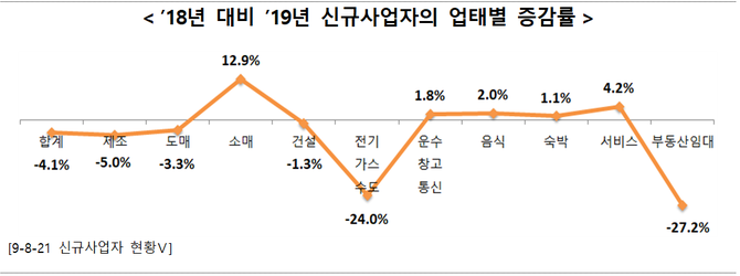 부동산임대업의 경우 2000만원 미만 소액임대사업자 과세시행을 앞두고 임대사업자 등록이 2018년 쏠린 데 따른 기저효과로 풀이된다.