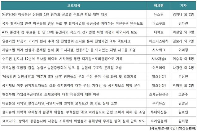 보도 부문은 ▲뉴스핌 김지나 기자 외 2명 ▲더스쿠프 김다린 기자 ▲더팩트 이철영 기자 외 3명 ▲비즈니스워치 김보라 기자 외 2명 ▲시사위크 이미정 기자 ▲시사저널e 이승욱 기자 외 5명 ▲이투데이 나경연 기자 외 1명 ▲일요신문i 문상현 기자 ▲일요신문i 박형민 기자 외 2명 ▲조세금융신문 고승주 기자 ▲쿠키뉴스 김양균 기자 ▲투데이신문 김효인 기자 ▲프라임경제 김화평 기자 등 총 13개 팀이 수상의 영예를 안게 됐다.