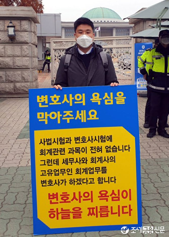 (조세금융신문=김용진 기자) 김희철 한국세무사고시회 사업부회장과 심재용 세무사가 17일 국회 정문앞에서 "사법 시험과 변호사 시험에 회계 관련 과목이 전혀 없는데도, 세무사와 회계사의 고유 회계 업무를 변호사가 하겠다고 한다."는 피켓을 들고 1인 시위를 하고 있다.