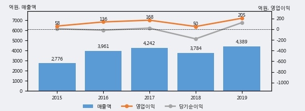 최근 실적을 살펴보면 2019년 매출액이 최근 5년 중 가장 높은 실적을 기록했음을 알 수 있다. 이전 최고 실적이었던 2017년 보다도 3.4%(146억 2천만원) 늘어난 것으로 나타났다.