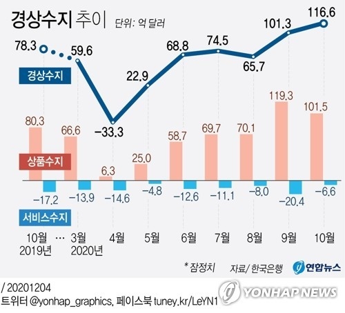 앞서 10월 경상수지는 116억6천만달러 흑자로, 두 달 연속 100억달러를 넘어섰다.