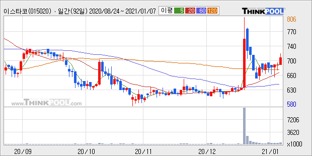 이스타코는 2019년 매출액 238억원과 영업이익 39억원을 기록했다. 전년대비 매출은 296.3% 상승했고, 영업이익은 흑자전환했다. 이 회사의 매출액 증감률과 영업이익 증감률은 각각 코스피 상위 1%, 상위 2%에 해당된다.