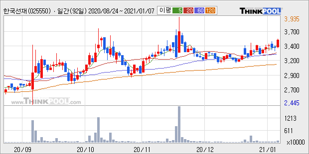 일봉 차트의 모습은 현재 단기·중기 이평선이 정배열 상태로 전형적인 상승세를 보이고 있다. 최근 이 종목의 차트에서 삼선전환도(양전환), 일목균형표 선행스팬 상향돌파(매수) 등의 특이사항이 발생했다.