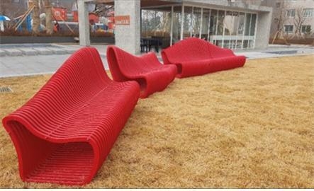 현대건설이 국내 최초로 적용한 비정형 조경구조물은 폭 1m, 높이 1m, 길이 8m짜리 옥외용 벤치로, 각기 다른 형상으로 이뤄진 약 200개의 부재를 3D프린팅 기법으로 가공해 제작했다.