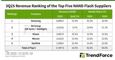 (조세금융신문=구재회 기자) 올해 3분기 글로벌 낸드플래시 매출이 감산 효과와 데이터센터에 탑재되는 기업용 솔리드 스테이트 드라이브(eSSD)의 출하로 증가한 가운데 삼성전자가 시장 점유율 1위를 지켰다. 3일 시장조사업체 트렌드포스에 따르면 3분기 전 세계 낸드 상위 5개 브랜드의 합산 매출은 지난 2분기 대비 16.5% 증가한 약 171억달러를 기록했다. 트렌드포스는 "클라우드 서비스 제공업체(CSP)들의 지속적인 인공지능(AI) 인프라 확장이 3분기 eSSD에 대한 강한 수요를 촉발했다"며 "올해 초 시행된 감산도 시장에 영향을 미쳐 하반기 공급과 수요 균형을 맞추는 데 도움이 되고 있다"고 분석했다. 이에 따라 공급업체들의 평균판매단가(ASP)도 상승했다. 4분기에도 트리플레벨셀(TLC)·쿼드레벨셀(QLC) eSSD 수요 증가, 하드디스크(HDD) 공급 부족으로 낸드 전체 가격이 20∼25% 상승해 분기 매출은 더 늘어날 것으로 트렌드포스는 전망했다. 업체별로 보면 3분기 삼성전자의 낸드 매출은 전 분기보다 15.4% 늘어난 60억달러를 달성했다. 모바일 낸드 시장에서 중국 현지 브랜드와 경쟁이 심화했지만, 견조한 eSSD 출하에 힘입어 전 분기(32