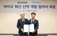 (조세금융신문=권영지 기자) 유한양행(대표 조욱제)과 프로젠(대표 김종균)이 지난 15일 프로젠 본사에서 바이오 혁신 신약 공동개발을 위한 업무협약(MOU)을 체결했다고 밝혔다. 양사는 이번 MOU 체결로 프로젠이 보유한 다중 표적 항체 기반 플랫폼 기술을 활용해 혁신적인 신약개발 기초연구 협력, 바이오신약 후보물질의 공동개발 추진, 초기 신약 후보물질의 기술이전과 상용화 협력을 진행하며, 상호 교류를 지속적으로 확대해 나갈 계획이다. 조욱제 유한양행 대표는 “기초연구 역량이 높은 프로젠과의 협력을 통해서 글로벌 경쟁력이 있는 바이오 신약 개발이 진행되고, 향후 유한양행의 바이오 신약 개발 역량을 한층 더 강화시켜 줄 것으로 기대한다”고 말했다. 김종균 프로젠 대표는 “오픈이노베이션 리더인 유한양행과 함께 지속적인 협력 연구를 통해 난치질환 환자들에게 필요한 블록버스터 혁신 신약 개발로 글로벌 바이오 기업으로 성장할 수 있도록 노력하겠다”고 다짐했다. 유한양행 관계자는 "이번 연구협력으로 양사의 바이오 혁신신약 개발이 더욱 가속화 될 것으로 보인다"며 "국내 연구역량이 뛰어난 바이오벤처와 대형 제약기업의 성공적인 신약 공동개발의 모델이 될 것으로 기대된다"고