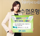(조세금융신문=김사선 기자) 수협은행(은행장 이원태)이 봄을 맞아 4월 1일부터 ‘고객 사랑海 천사(1004)이벤트’를 진행한다.이벤트는 수협 창립기념일인 4월 1일부터 5월 31일까지 2개월간 진행되며, 추첨을 통해 총 1004명에게 트롬 스타일러 4대, 수협은행 대표 여름행사 썸머페스티벌 초청권 150매(1매당 4명 총 600명), 해외여행 시 유용한 달러북 400권 등 푸짐한 경품을 제공한다. 또 당첨여부와 상관없이 참가 고객 전원에게는 환율우대 쿠폰을 제공한다.참가 대상은 개인고객이며, 예금․대출․공제․카드․펀드․신탁․외환․스마트폰뱅킹 등의 이벤트 대상 상품 중 1개만 가입하면 당첨기회가 주어진다. 가입상품의 수에 따라 최대 5번의 당첨기회가 주어지며, 당첨자는 6월 30일 수협은행 홈페이지를 통해 발표할 예정이다.수협은행 관계자는 “봄을 맞아 고객 감사의 뜻을 담아 이번 이벤트를 기획했다”며, “앞으로도 다양한 테마로 이벤트를 진행하여 고객과 함께 하는 수협은행이 될 수 있도록 최선의 노력을 다하겠다”고 말했다.