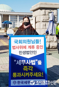 (조세금융신문=김용진 기자) 김순화 세무사가 가 10일 오전 국회 정문 앞에서 법사위에 계류중인 민생법안인 세무사법을 즉각 의결하라는 1인 시위를 하고있다. [조세금융신문(tfmedia.co.kr), 무단전재 및 재배포 금지]