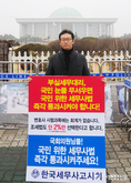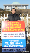 (조세금융신문=김용진 기자) 김현배 한국세무사고시회 지방,청년 이사가 17일 오후 국회 정문 앞에서 기장 대행과 성실 확인 업무 허용 하지 않는 세무사법을 즉각 의결하라는 1인시위를 하고있다. [조세금융신문(tfmedia.co.kr), 무단전재 및 재배포 금지]