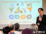 (조세금융신문=김용진 기자) 황선의 국세동우회 부회장이 18일 오전 서울특별시립강동노인종합복지관에서 열린 한국세무사회와 국세동우회 배식 봉사활동에서 알기 쉬운 세금 강의'를 하고 있다. [조세금융신문(tfmedia.co.kr), 무단전재 및 재배포 금지]